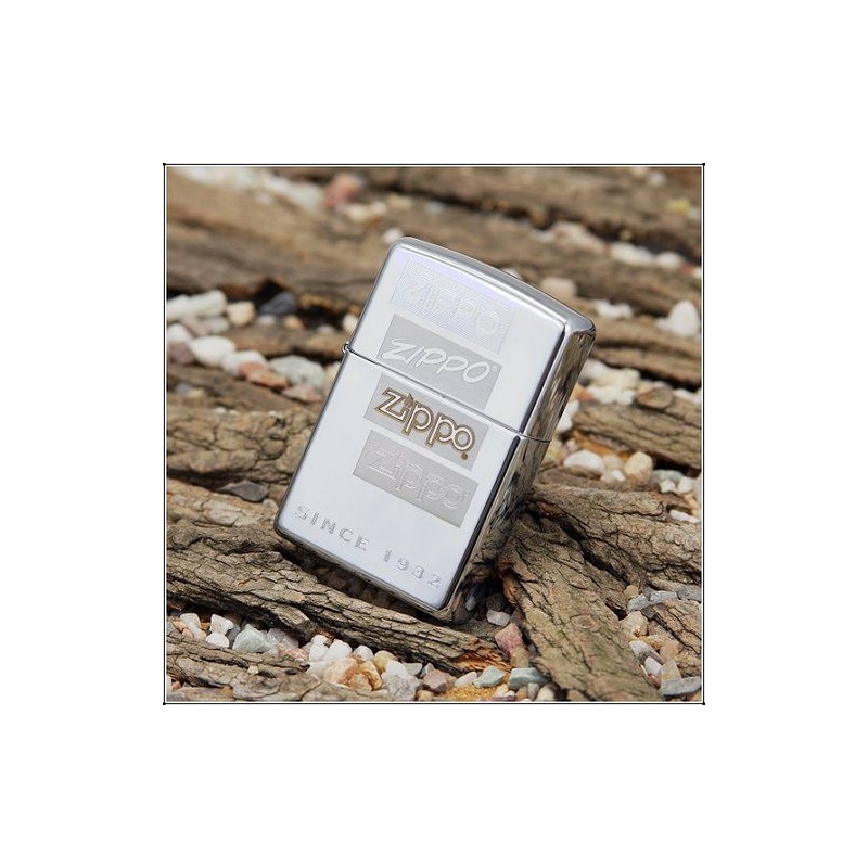 Зажигалка Zippo с изображением нескольких поколений логотипа компании. Гравировка.